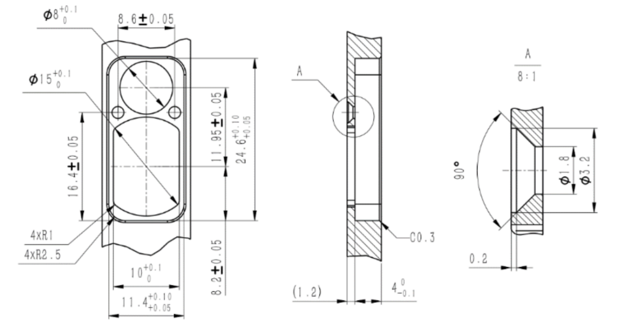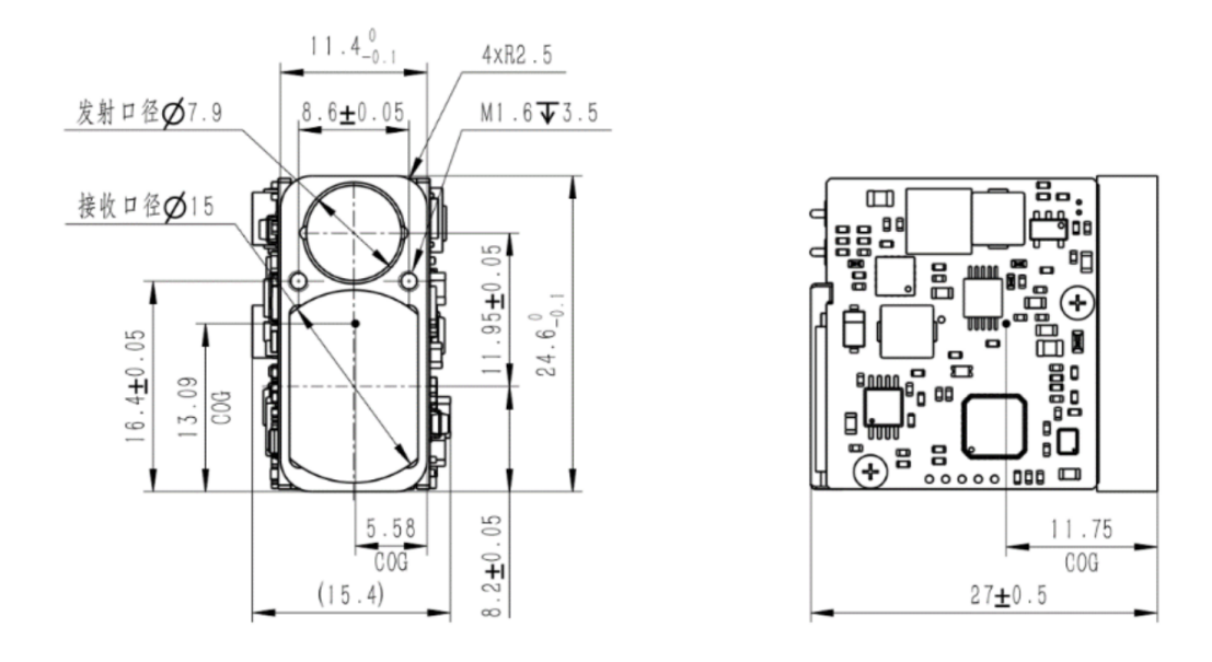 The effective aperture of the optical window depends on different products. Its external dimension should ensure that the effective aperture of the optical window - the outer diameter of the optical window ≥ 2mm, and the outer diameter of the rangefinder antenna - the projected dimension of the effective aperture of the optical window ≥ 1.5mm. The schematic diagram is shown as follows. Since the optical window has a certain absorption of the laser, it is recommended that the thickness of the optical window itself be controlled within 2 to 4mm according to the external dimension.
