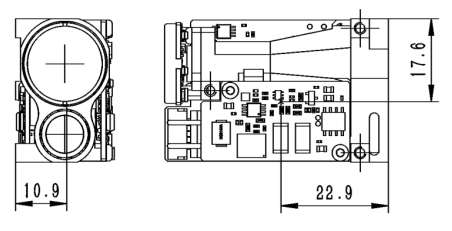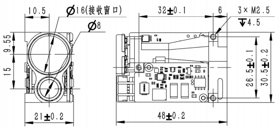 The external dimensions of the ranging module and the user installation interface are shown in the figure below.