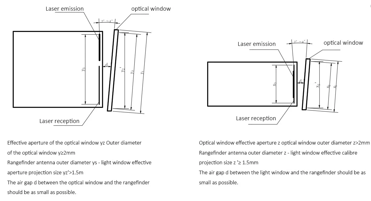 Because the light window has a high transmittance, it is recommended that the axis deviation between the emission optical axis and the normal axis of the light window be controlled within 2°~4°. The schematic diagram of the position of the light window and the two barrels is shown in the figure below. At the same time, the air interval between the light window and the rangefinder should be as small as possible.
